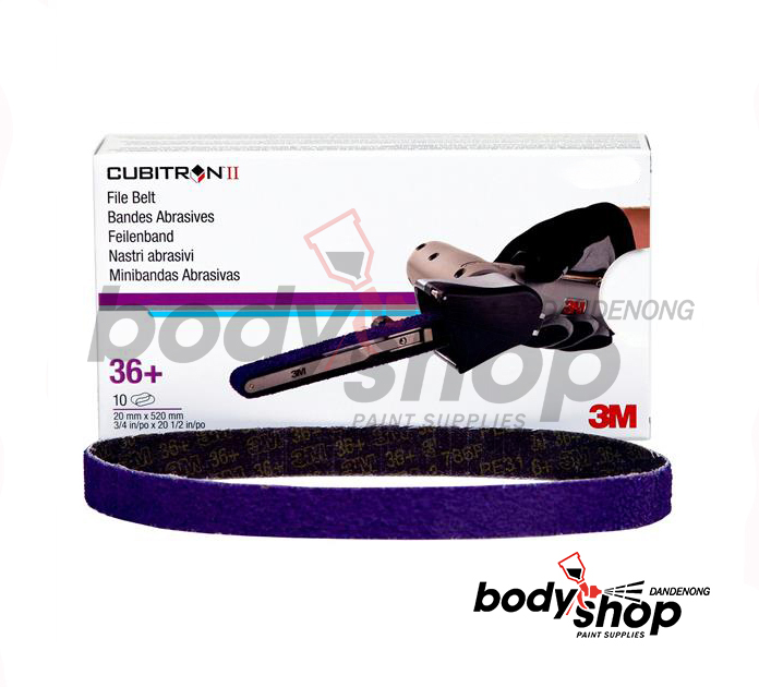 Our 3M Cubitron II File Belt 786F is designed for use with the 3M File Belt Sander, for tasks like grinding out rivets and removing spot welds. 3M Precision Shaped Grain is resin-bonded on a heavy duty backing for a more consistent finish, cooler operation and two times more belt life. The resin bond and a grinding aid keep this belt cutting cool and sharp.